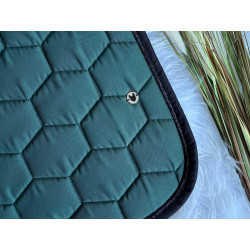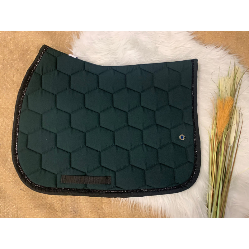 Découvrez notre sublime tapis de selle vert forêt, bordé de noir et orné de paillettes noires pour un style élégant et moderne. Fabriqué avec des matériaux de qualité pour un confort optimal, ce tapis de selle est le choix parfait pour les cavaliers soucieux de leur style et du confort de leur cheval